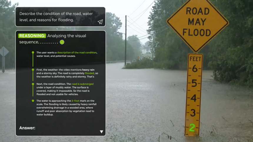 Example of how Cosmos Reason can understand text embedded within a video to determine the condition of the road during a rainstorm. Developers can jumpstart development of video analytics AI agents by using the NVIDIA blueprint for video search and summarization (VSS) with Cosmos Reason as the VLM.